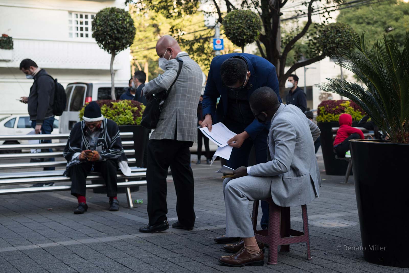 Una persona migrante acompañada de su abogado revisa documentos afuera del edificio del Instituto Nacional de Migración en la Ciudad de México, donde las filas para realizar trámites comienzan a formarse desde las 4 a. m. El último censo del INEGI muestra que en 2020 más de 1 200 000 personas extranjeras residían en México. La Unidad de Política Migratoria informa que se emitieron o renovaron 180 000 tarjetas de residencia tanto temporal como permanente, se expidieron más de 23 000 tarjetas de visitantes por razones humanitarias y más de 32 000 tarjetas de visitantes regionales.