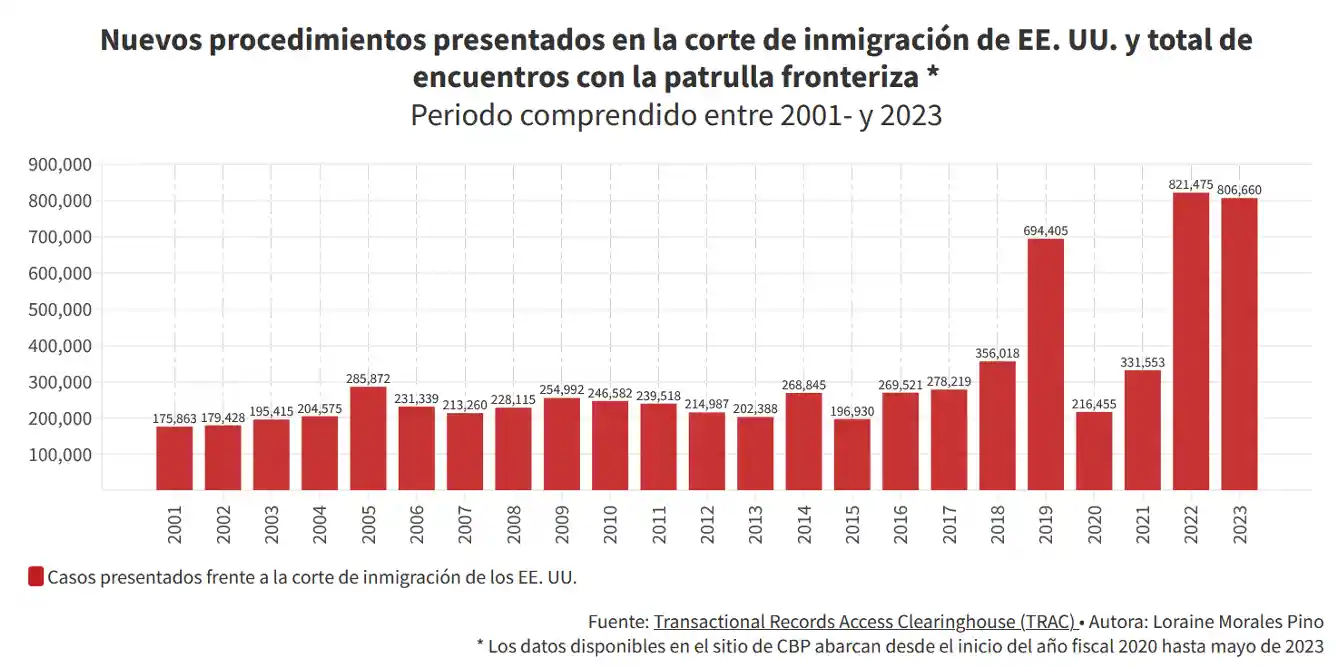 La tendencia general indica que existe un alza en el número total de casos registrados en las cortes de Estados Unidos desde octubre de 2000 hasta mayo de 2023, superando los siete millones de procesos judiciales en todo el periodo. Sin embargo, dicho aumento está relacionado con el incremento de los flujos migratorios hacia Estados Unidos de personas que buscan protección internacional.