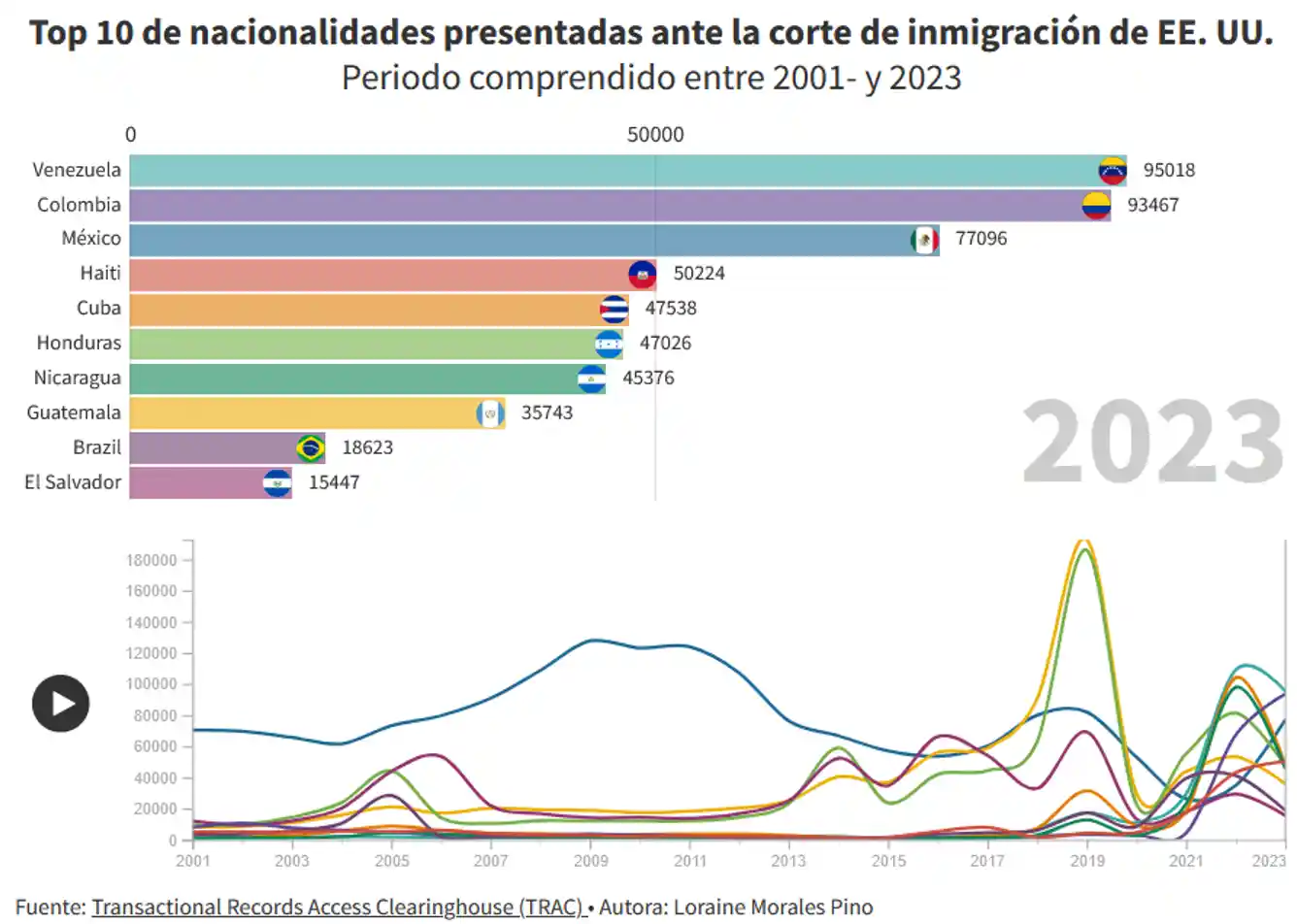Durante el periodo comprendido entre octubre de 2022 y mayo de 2023 —año fiscal actual— la nacionalidad venezolana ocupa el primer lugar en términos de número de casos presentados ante la Corte de Inmigración de Estados Unidos. Estos casos fueron sucedidos por ciudadanos de Colombia, México, Haití y Cuba quienes también encabezaron la lista en cuanto a número de procesos.