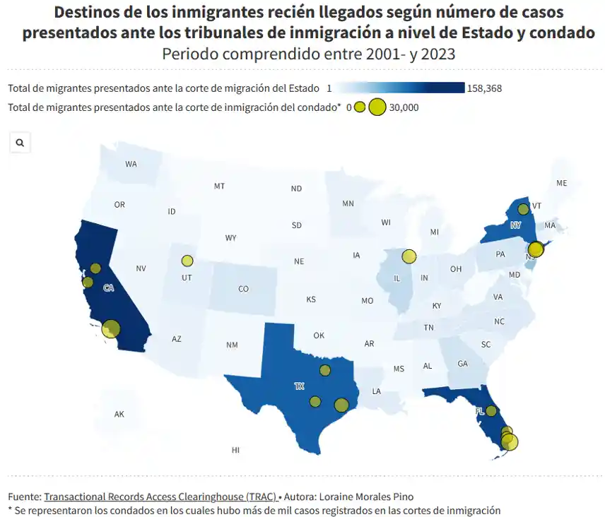 Al analizar el número de casos presentados ante la Corte de Inmigración en función del condado de residencia de los inmigrantes, se observa que el 68 % de los casos judiciales registrados desde octubre de 2020 hasta mayo de 2023 se concentran en tan sólo 84 condados. A su vez, los principales destinos se encuentran en los estados de California (113 910), Florida (105 802), Texas (93 414) y Nueva York (93 352).
